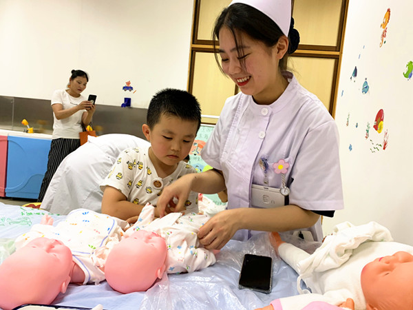 活动开始由实训专业课教师吴佳妮向幼儿园的小朋友及教师讲解心肺复苏的要领、血压听诊、婴儿喂奶及沐浴的相关知识;专业教师顾雯青指导学生抢救病人的最佳做法、心肺复苏的正确姿势、血压计的使用等;教师郁晶教导幼儿园的小朋友给婴儿穿脱衣服、喂奶、沐浴洗头等的要领。