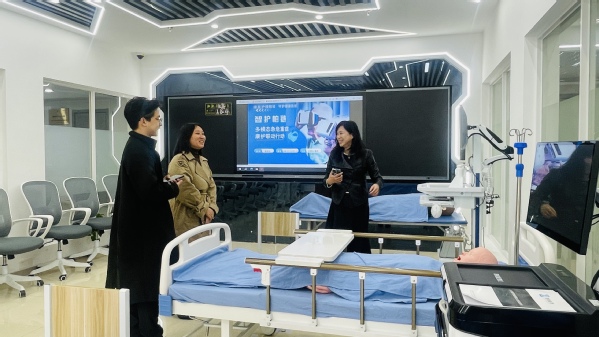 会后,张美琴陪同陆泓锦总经理、熊小芳副总经理一行参观了学院康复护理实训室、智慧护理实验室等教学场地。实训场地配备先进的康复设备与智慧化教学设施,精准模拟真实临床场景,为学生提供沉浸式实训环境。企业代表对学院的办学实力、先进的实训条件及教学环境给予高度评价,认为双方合作契合度高,具备广阔的合作空间与发展潜力。