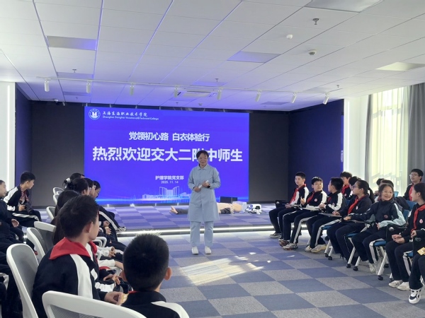 • 为深入贯彻落实立德树人根本任务,充分发挥基层党组织战斗堡垒作用与党员先锋模范作用,11月14日,护理学院党支部对接上海交通大学第二附属中学预初5班联合策划并开展“白衣天使职业体验日”主题教育活动。此次活动以党建为核心引擎,激活高校专业资源服务基础教育的动能,通过“护理小天使”闯关赛的创新形式,为中学生搭建起了解护理职业、感悟生命价值的实践平台,彰显了基层党支部践行教育使命的责任担当。活动在简短的欢迎与分组后,进入“护理小天使”闯关赛环节。同学们分为四组,在20分钟一站的轮换中,深度体验了四项核心护理技能。新生儿照护站:马兰老师利用婴儿模型,耐心传授如何正确环抱新生儿及沐浴等照护知识。同学们在小心翼翼操作中,感受了守护生命的细腻与温柔。血压监测站:在王娟老师的讲解和志愿者的协助下,同学们两两一组,学习血压计的使用方法,并为同伴测量血压,获得了写有真实数值的“健康数据”签章。急救小英雄站:在李文老师的指导下,同学们学习了“黄金4分钟”的重要性,并在模拟人上进行了心肺复苏(CPR)胸外按压的实践练习,动作达标后荣获“急救小英雄”签章,深刻体会到急救工作的紧迫与严谨。伤口守护者站:唐建娟老师向